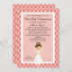 Comece a comemorar com este adorável convite para as meninas especiais Primeira Comunhão Sagrada. Ele tem um cor-de-rosa profundo com rosa claro grande borda de bolinhas. no centro há um centro de rosas claro com uma borda branca à sua volta Há uma menina adorável vestindo um vestido branco de comunhão com um véu. Ela tem cabelo castanho. Veja os muitos outros itens nesta linha, como etiquetas, postagens, notas de agradecimento e muito mais.