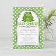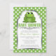 Convites verdes e cinzentos do chá de fraldas com uma ilustração do sapo adorável, verde sobre um teste padrão de bolinhas verde e branco. Estes são os convites perfeitos para chás de fraldas, quando o bebê está indo ser um menino, ou quando a cor favorita Mamãe-à-Estar é verde.