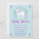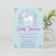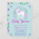 Este convite para chá de fraldas apresenta um design de unicórnio floral bonito com elementos brilhantes cor-de-rosa falso num fundo aqua. Há um padrão atrás. Personalize com seu próprio texto. Outros itens correspondentes a este design também estão disponíveis. Visite as páginas de coleta em nossa loja para ver o intervalo de cheios.