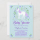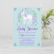 Este convite para chá de fraldas apresenta um design de unicórnio floral bonito com elementos faux roxos de brilho num fundo aqua. Há um padrão atrás. Personalize com seu próprio texto. Outros itens de chá de fraldas correspondentes a este design também estão disponíveis. Visite as páginas de coleta em nossa loja para ver o intervalo de cheios.