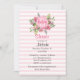 Convite de chá de fraldas em Striped rosa rosa, com um arranjo bonito de flor de pénia rosa no topo, com um disco rosa no meio com texto. Personalize todos os campos de texto para o evento do seu chá de fraldas.