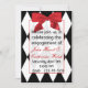 Convite Bonito para design de Harlequin, preto e branco, com um arco vermelho bonito e área de texto delineada. Personalize o estilo, a cor e o tamanho do texto na parte frontal e traseira deste convite de festas com aparência de excelente.