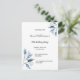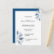 Um convite para festa de aniversário elegante e simples. Na frente, um fundo branco chico decorado com ramos botânicos azuis, florais. Modelos para um nome, 90 anos e detalhes da sua festa. Voltar: cor azul clássica do fundo. Dica: Se você não quiser que pareça um cartão postal, clique em personalizar, vá para o verso e remova o divisor e o carimbo de posto.