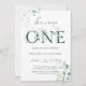 O primeiro convite de aniversário apresenta a cor d'água do eucalipto e folhas verdes pintadas com letras verdes botânicas. Para personalização mais avançada deste design, clique em personalizar outro link para alterar a fonte, o tamanho e a cor.