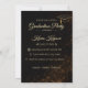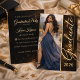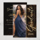 Design de graduação preto e dourado com um fundo de poeira brilhante, exibição de nome em escrita fluida e layout refinado. Combinado com uma foto completa na frente e detalhes limpos do evento no verso. Ideal para organizar uma noite de graduação sofisticada com jantar, bebidas e dança.