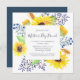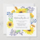 Nosso convite para o almoço do Flowerfields em um formato quadrado exclusivo enquadra seus detalhes de lanche ou almoço de Dia de as mães com girassóis de cor amarela, folhas verdes exuberantes e botões roxos e azuis.