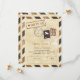 Convite Inspirado em Correio com tons Vintage de Marrom Escuro e Claro. Selo Falso e Marcações de Postagem para um Casamento com Tema de Viagem.