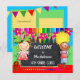 Um cartão postal alegre com crianças felizes em um fundo de chalkboard com lápis coloridos. A parte traseira deste cartão postal tem várias formas retangulares modelo. Você pode personalizá-los ou excluí-los se quiser.