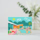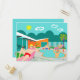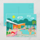 Este Cartão-postal de Piscina Retro apresenta quatro beefcakes achatados tendo um gay de vida à medida que batem no calor da Palma Primavera, soltando-se ao redor da água azul turquesa de sua piscina natatória em forma de bumerangue atômico. A arquitetura moderna do meio século, na fabulosa casa de pedra laranja, é claramente um terreno privilegiado, dada a visão das montanhas ao fundo. Um sol amarelo estrelado brilha intensamente no céu turquesa para que você possa ver todos os detalhes charmosos - desde os flamingos cor-de-rosa até a cerca riscada de 1950 e a cerca de quarteirões. E, claro, que palmeira Primavera seria completa sem palmeira?
