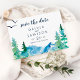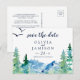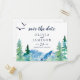 Este cartão postal de Rocky Mountain destination save the date é perfeito para um casamento ao ar livre. O design apresenta uma paisagem selvagem pintada em azul e verde com árvores de pinheiro em aquarela, pássaros e montanhas.