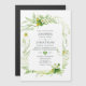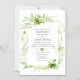 Convite de casamento verde e branco com samambaias, flores silvestres e morangos e um fundo de lavagem de cor verde-aquosa.