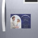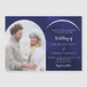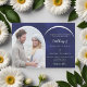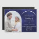 Um marinho de fundo azul, convite de casamento para a revista fotográfica. O fundo azul é irregular. Texto branco. Na frente: adicione sua própria foto de tamanho vertical. Personalize e adicione seus nomes e detalhes.