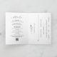 Clássico, tudo em um convite de casamento dobrado, com um design preto e branco simples e mínimo, com uma combinação de fontes serif tradicionais e um roteiro elegante junto com sua data em um formato grande para um toque moderno, sobre sua foto favorita. O painel dentro à esquerda tem seus detalhes adicionais. Use o modelo para gerar um código QR ou removê-lo na ferramenta de edição de design. O painel dentro tem a placa RSVP. Este convite de casamento elegante é excelente para um casamento formal.