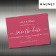 Um moderno e elegante cartão magnético Salve a data para um casamento. Um fundo de cor magenta. Personalize e adicione uma data e nomes. O texto: Salvar a Data é gravado com um script de estilo com letra de tendência grande.
