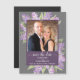 Esse belo casamento, salvar os cartões de data, apresenta um design de cor d'água pintado com a mão rústica com sua foto em uma armação roxa empoeirada cercada por um monte de flores lilás e verde em um fundo de cinza. Há espaço para seus nomes, data e local do casamento. Excelente maneira de facilitar para seus amigos e família lembrarem-se de sua próxima data de casamento.