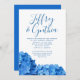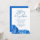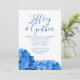 Simples modelo de convite para casamento de hydrangea azul. Personalize facilmente duas áreas de texto usando nomes próprios do casal no topo. O texto do convite é apresentado sob a forma de parágrafo para utilizar a maior quantidade possível de texto, incluindo um endereço de recepção. Também adicione um RSVP para simplificar as coisas. O texto azul é impresso sobre papel branco e as flores fazem uma bonito borda na parte inferior. O reverso é azul sólido.