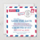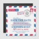 Uma Viagem criativa divertida, com o tema Celebração de Aniversário Salve a Data para enviar a todos os seus convidados com este design de Correio Vermelho e Azul. Mapa da República Dominicana colocado no centro do design em cor azul mais clara. Para obter informações sobre alterações de design personalizadas pelo designer independente, envie um email para paula@labellarue.com ANTES de personalizar ou fazer um pedido.
