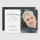 Convide amigos e família para compartilhar suas histórias e memórias favoritas com esta elegante celebração do convite à vida. Este design apresenta uma foto da que está sendo celebrada, juntamente com o script de cinza e fontes de bloqueio.