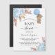 Para um chá de fraldas moderno estilo boho. Fundo branco. Decorado com flores azuis-claras, rosas, grama-pampas e um ursinho-peluche segurando um balão azul. Personalize e adicione um nome e detalhes da parte.