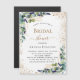Bem-vindo a um Chá de panela elegante. Um fundo branco chic. Decorados com folhas de eucalipto, prigos, verde, folhas de ouro falso e pó de ouro, de cor aquosa verde. Personalize e adicione o nome da noiva a ser e os detalhes da parte. Letras pretas e ouros.