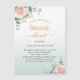 Fundo verde e gradiente branco. Decorados com ouro-rosa e flores cor-de-rosa, flores rosa e folhas de eucalipto, borras, verde e borras de ouro. Personalize e adicione o nome da noiva a ser e os detalhes da festa. Letras pretas e ouros coloridas.