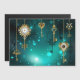 Chaves Douradas e antigas com engrenagens e marcadores penduram em correntes douradas sobre fundo verde luminoso.