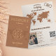 Modern Boho World Map Invitation Destination, como passaporte, com seu monograma. Adicione seu código QR. Cor de fundo do terracotta laranja queimado