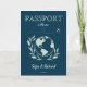Modern Boho World Map Invitation Destination, como passaporte, com seu monograma. Adicione seu código QR. cor azul de fundo do marinho