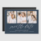 Anuncie seus futuros nupciais em estilo com nossa imã salve a data de fotos do Elegant Script. Os imã salve o dia elegantes exibem 3 de suas fotos de noivado favoritas com "salve a data" em um roteiro de caligrafia branco e moderno contra um fundo de marinho. Personalize o imã adicionando seus nomes, data do casamento e local do casamento.