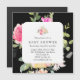 Um belo convite magnético para chás de fraldas florais de aquarelas inclui um buquê colorido de flores pastéis brilhantes sobre um fundo preto elegante.