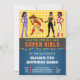 Surpreenda seus convidados com estes o convite de aniversário legal que caracteriza meninas do super-herói e a tipografia corajosa. Adicione simplesmente seus detalhes do evento neste modelo fácil de usar para fazer-lhe um convite um--um-amável. Lance o cartão sobre para revelar um teste padrão vermelho e azul do starburst na parte de trás do cartão.