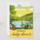 Um elegante convite de chá de fraldas neutro em termos de gênero que apresenta uma cena de paisagem colorida com um brilhante sol brilhante. Um belo lago, flores frescas de primavera e uma borboleta se somam a uma atmosfera alegre. Os textos do "Chá de fraldas" são imagens de script separadas e podem ser excluídos se você preferir textos personalizados.
