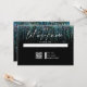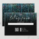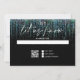 RSVP Abstrato Moderno - Uma guirlanda ousada e brilhante em azul teal cascata pela página, em caligrafia manuscrita está "nos avise" - iniciais do casal no topo - o resto do texto é simples e limpo - tudo em um fundo preto. Papelaria de casamento elegante.