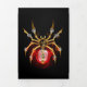 Aranha mecânica, com pá-pá de ouro, engrenagens de latão e uma lâmpada de vidro vermelha sobre fundo preto. Estilo Steampunk.