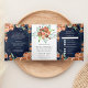 Convite Com Dobra Tripla Casamento Azul de Marinho Floral Laranja Queimado