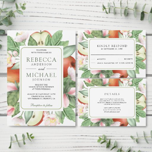 Incêndios para seus convidados com este elegante convite de casamento tema maçã com um belo quadro com maçãs e flores e tipografia moderna com código QR para RSVP online. Basta adicionar os detalhes do seu evento neste modelo fácil de usar e adorar este cartão com as suas fotografias favoritas para o tornar um convite único.
