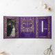 Anuncie seu casamento em estilo com este convite de fantasia medieval triplo! Este convite apresenta uma grande espada de ouro e flores, com uma foto especial do casal contra um fundo roxo — a combinação perfeita de romance e aventura. NOTA: este design NÃO apresenta folha de alumínio real. Dessplash forneceu a imagem de espaço reservado e NÃO está à venda; substitua-a pela sua foto.