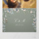 Um convite de casamento triplo elegante e completo, apresentando sua foto especial, iniciais monogramáticas e uma cascata de folhagem floral de flores silvestres que encerram os detalhes do seu casamento em um fundo verde salvia. O convite inclui detalhes da informação dos convidados para a celebração e um cartão RSVP destacável. Criado por Thisisnotme©