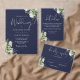Tudo em um convite de casamento azul de marinho triplo, com um arco de ouro chico, folhas botânicas verdes e sua foto especial. O convite inclui os detalhes de informações de seus convidados de celebração e um cartão RSVP destacável. Projetado por Thisnotme©