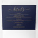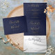 Tudo em um convite de casamento azul três vezes marinho com elegante tipografia de ouro. O convite inclui os detalhes das informações de convidado de celebração e um cartão RSVP destacável. Projetado por Thisnotme©