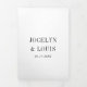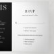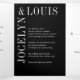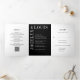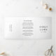 Moderno, tudo em um convite de casamento triplo com um design preto e branco minimalista com seus nomes em uma fonte grande ao longo do lado esquerdo e superior. O painel da placa de gabinete tem um código QR opcional. Você pode remover o código QR na ferramenta de edição de design. Esta design é simples o suficiente para um casamento formal, mas faz uma declaração ousada.