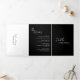 Um convite de casamento preto moderno, com um design simples e mínimo com o nome da noiva em um roteiro elegante e o nome do noivo em uma fonte sans serif contemporânea. Abaixo, no canto inferior direito, estão os detalhes do evento em um layout minimalista. O painel do meio tem sua foto favorita, o painel direito é sua placa RSVP e a parte traseira tem seus detalhes adicionais.