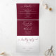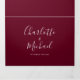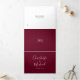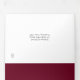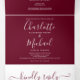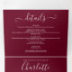 Convite de casamento tri-fold em borgonha tudo-em-um com tipografia elegante. O convite inclui detalhes das informações dos convidados para a celebração e um cartão RSVP destacável. Concebido por Thisisnotme©