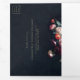 Um belo arranjo floral enquadra este maravilhoso convite de casamento com um tema romântico escuro e um formato "tudo em um". Um fundo marinho escuro com tons pretos é a canvas para a tipografia clássica e toques de caligrafia elegante em matiz dourada (efeito digital, não ouro real). Uma escolha perfeita para casais que adoram a vibração do casamento romântico sombrio e a papelaria de casamento com um design de pintura, no estilo dos velhos mestrados holandeses. Um convite de casamento escuro e humilde que dá muita cor e uma grande variedade de opções de cores para combinar um vestido preto de casamento ou um casamento azul escuro. Elegante e romântico, este é um clássico convite de casamento. Um convite elegante e moderno para um casamento de conto de fadas, inclui o cartão de detalhes e o RSVP. Ele também tem uma modelo para uma foto do casal. Perfeito para noivas que amam o casamento de conto de fadas com um tema escuro e melancólico e que preferem um selo e enviam, tudo em um formato para a papelaria do casamento.
