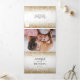 Escrita minimalista de tendências, tudo em um convite triplo de casamento, com um fundo branco, bordas modernas de ouro, uma foto do casal noivo, seus detalhes de casamento, um convite de casamento e um cartão postal de comida rsvp para seus convidados cortarem e enviarem de volta.