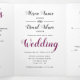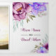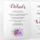 Convite Tri-Fold de casamento com cartão RSVP destacado. Um adorável design de casamento que inclui flores de aguarela em tons de roxo e azul e folhas. Os nomes estão em tipografia cursiva. Corte o último painel interno e use-o como cartão de resposta. O painel traseiro externo inclui uma foto do casal.