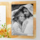 Flores de aquarela laranja e folhas de vassoura floral caem três vezes no convite de casamento. Este elegante design exibe um quadro dourado e flores cor d'água laranja do cacto com folhas suculentas e eucaliptas nos cantos superior esquerdo e inferior direito e seu texto em laranja e preto no cobrir. O primeiro e último painéis do dentro, assim como a aba externa, incluem fotos do casal enquanto o painel do meio do dentro mostra os detalhes do seu casamento. Os fundos externos mostram detalhes sobre RSVP e muito mais.