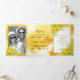 Flores amarelas de aquarela e folhas de boho floral, triplo convite para casamentos. Esta elegante design mostra uma moldura dourada e flores amarelas de aquarela com folhas suculentas e eucaliptas nos cantos superior esquerdo e inferior direito e seu texto em ouro e preto no cobrir. O primeiro e último painéis do dentro, assim como a aba externa, incluem fotos do casal enquanto o painel do meio do dentro mostra os detalhes do seu casamento. Os fundos externos mostram detalhes sobre RSVP e muito mais.