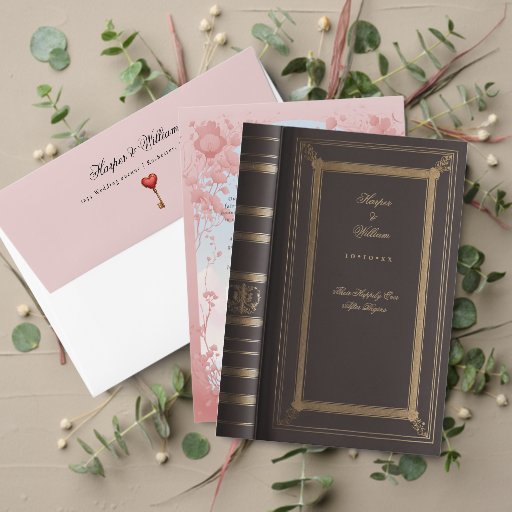 Entra num mundo sonhador de amor e encantamento com este convite de casamento. O cobrir da frente, que lembra um livro querido, se abre para revelar os detalhes do seu casamento romântico do castelo da princesa. O castelo de conto de fadas, abraçado por nuvens sonhadoras e dois beija-flores partilhando um beijo, é enquadrado com uma delicada fronteira floral rosa. Perfeito para aqueles que acreditam na magia do amor e anseiam pelo começo de um livro de histórias.