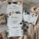 Este elegante casamento floral azul de ouro de três vezes é perfeito para um casamento rústico. O design apresenta belas flores azuis escuras, azuis, marinhos, rosa, pinceladas, douradas e folhagem verde pintadas manualmente, amontoadas em buquês elegantes. Salve o papel, incluindo mais detalhes no convite em vez de em uma placa de gabinete separada.